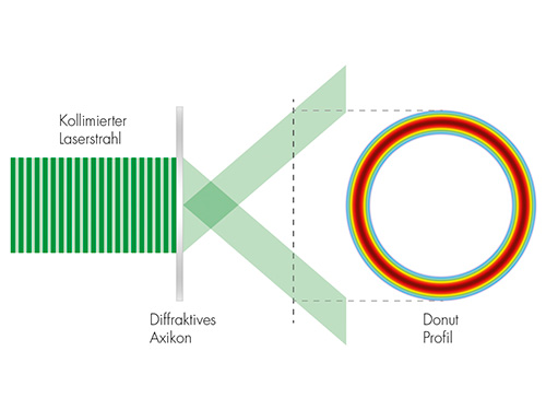 The ring profile must be produced. Often, classic axicons are used for this purpose: conical lenses and rotation-symmetrical prisms. These elements convert a laser beam with a Gaussian profile into a Bessel beam. Axicons are very difficult to produce for very large or very small fan angles because in such cases the cones have to be very flat or steep, respectively; thus, an optimal ring profile generally cannot be achieved.