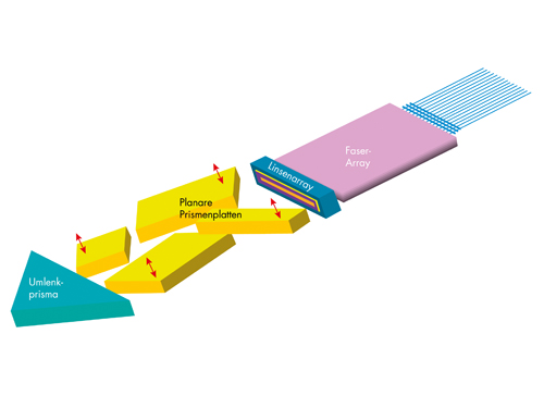 Input and output fibers are exactly arranged in a precision array. The light emerging from the input fiber is bundled into a parallel beam by a collimator lens of a micro-optical lens array. Using a reflecting prism, the light is fed through the corresponding element of the lens array back to the output fiber. Switching occurs when fine optical precision elements are introduced into the beam.