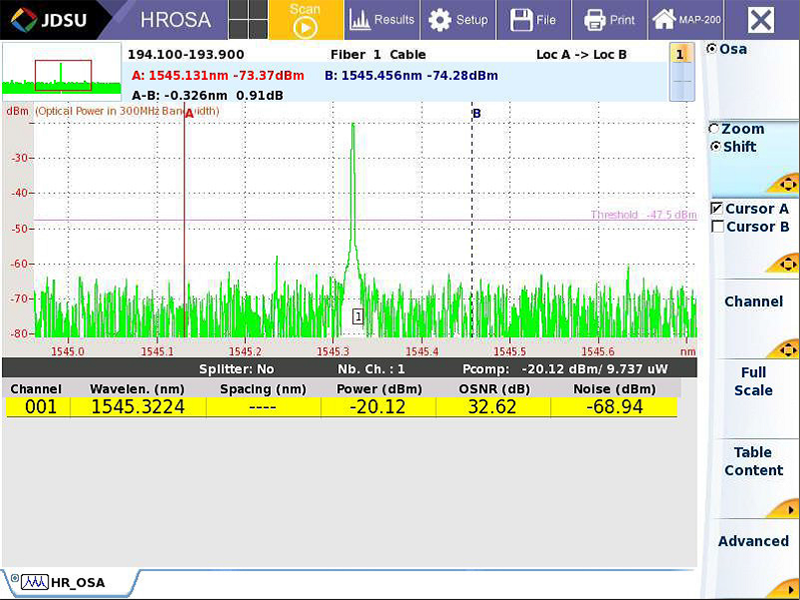 The mHROSA-A1 high-resolution optical spectrum analyzer module combines the multi-wavelength wave meter with a high-resolution optical spectrum analyzer. In addition to detection and measurement of the power levels, the OSA module also makes it possible to obtain a graphical representation of the spectrum. Typical applications include the characterization of DWDM transmission systems, optical sources, transponders, and line cards.
