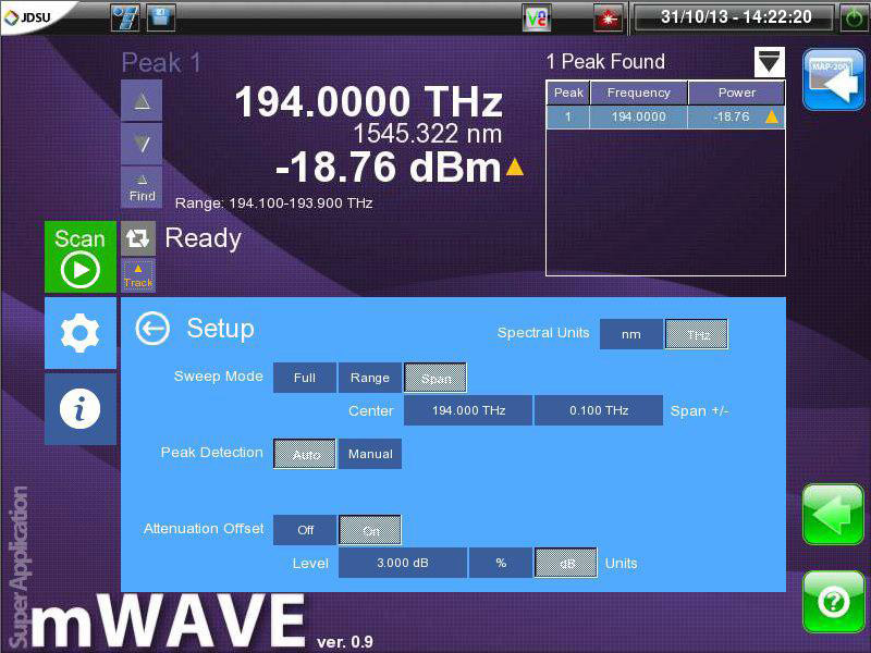 The mWAVE-A1 is a multi-wavelength wave meter that is used to detect the optical power levels and center wavelengths of densely-packed optical signals at up to 2 GHz spacing with the help of coherent detection technology. This technology is also used in the detection of the DWDM wavelengths and their power levels present in DWDM transmission systems.