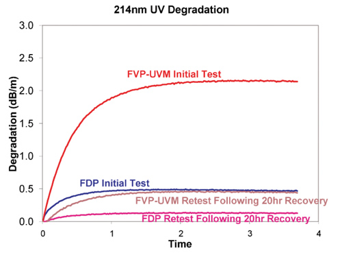 FVP-UVMI. The H2-enhanced FVP-UVMI fiber experiences barely any loss when used with UV light. At 214 nm, transmission stability was recorded for more than 8 hours. It also transmits reliably at wavelengths of less than 200 nm. The fiber has to be put to use almost immediately after delivery because it loses its hydrogen concentration with time and turns into an FVP-UVM fiber.