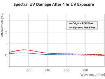 Features. The FDP fiber features an extremely high UV transmission and very low UV solarization; thus, it is particularly resistant to UV radiation. After the initial decrease in performance, this FDP fiber exhibits a transmission that is approximately 10% higher than that of its predecessor.