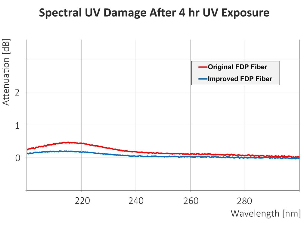 “We are pleased to be able to introduce to our customers a revised FDP fiber. Its introduction will revolutionize UV applications,” said a representative at Polymicro Technologies. The solarization of this new fiber was improved in the deep UV range at 190 nm to 325 nm. This means better light transmission and a longer life expectancy!