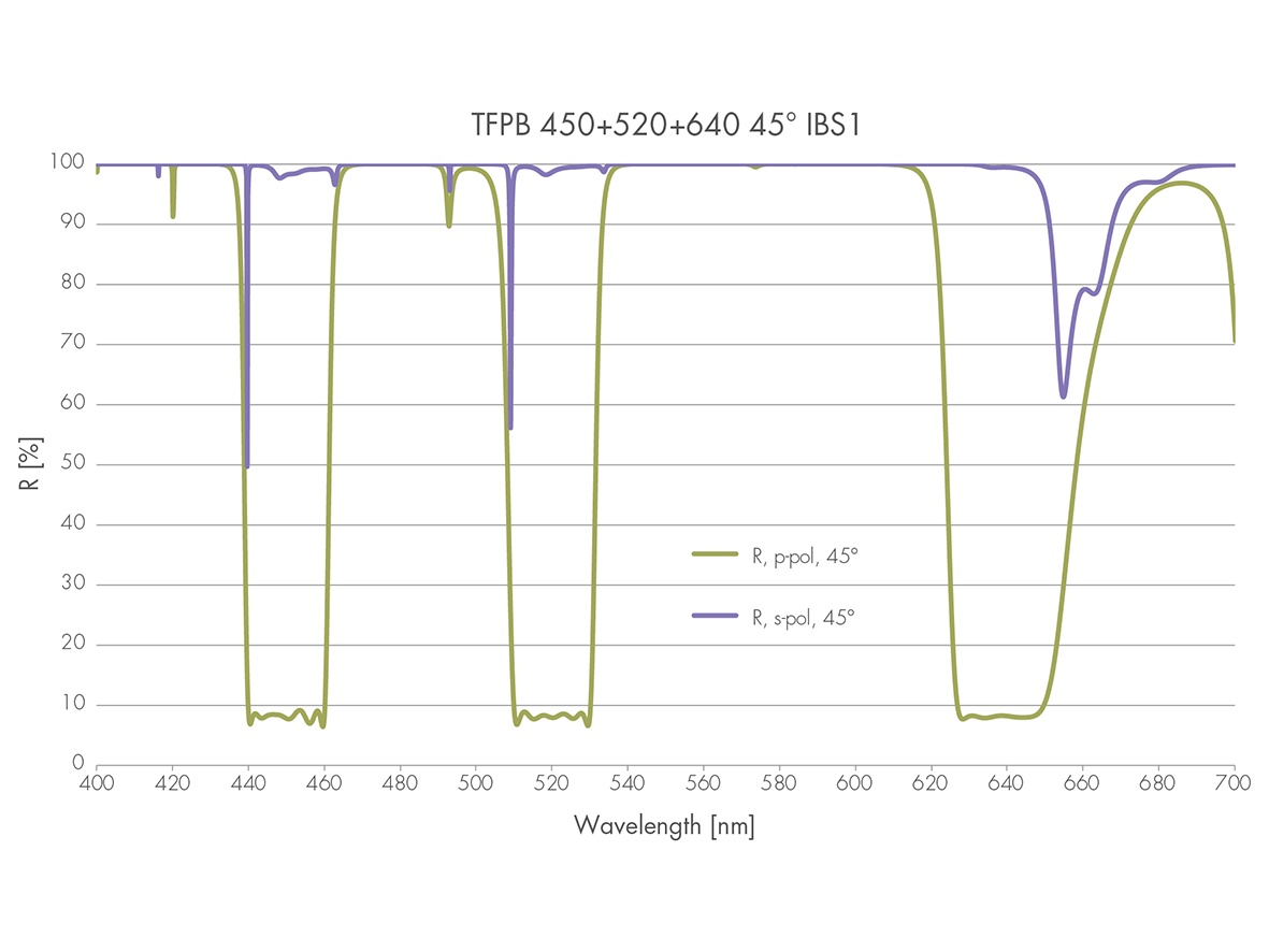 Le polariseur à couche mince trichroïque est conçu pour un angle d'incidence de 45° et présente d'excellentes propriétés de réflexion dans le rouge (640 nm), le vert (520 nm) et le bleu (450 nm) en polarisation s. La polarisation p, en revanche, est presque entièrement transmise.