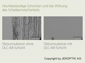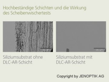 Auch im Frühling gilt: Der nächste Winter kommt bestimmt. Darum präsentieren wir auf unserem Messestand DLC-beschichtete IR-Fenster (Diamond-like Carbon) auf Silizium- oder Germaniumbasis, die den Scheibenwischertest unbeschadet überstehen (TS 1888 (Windscreen-Wiper-Test)). Gleichzeitig wirkt die Beschichtung als Einfachentspiegelung. In der Hybrid-DLC Variante werden diese Schichten in einem speziellen Verfahren mit dielektrischen Schichten kombiniert. Und wer lieber den Sommer mag: Diese IR-Optiken überstehen auch Sandstrahlen.