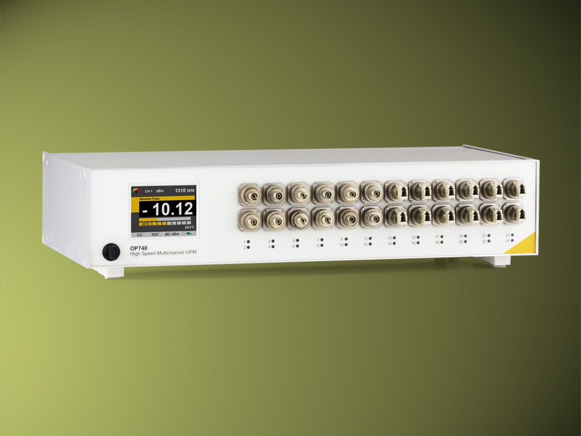With the OP740 from OptoTest, LASER COMPONENTS offers a high-speed solution for measuring the power of optical fibers from multiple channels. This device makes it possible to measure up to 125,000 samples per second with up to twenty-four fibers. In contrast to other systems, a separate, independent measuring unit is used for each fiber. This not only increases the speed but the accuracy of the measurement results as well. The relative measuring accuracy of the OP740 is ±0.02 dB. Thanks to this combination of high sampling rate and accuracy, even short signal dropouts in individual fibers can be detected as part of a dropout test.