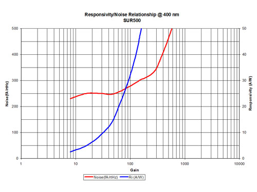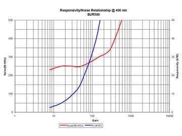 La série SUR offre d‘excellentes performances en DUV. En outre, la sensibilité de cette nouvelle structure APD reste élevée plus loin dans les basses longueurs d’onde UV que tous les détecteurs actuellement commercialisés. Son fonctionnement une fois montée en boîtier est finalement limité uniquement par la transmis-sion de la fenêtre, laquelle est optimisée pour des longueurs d‘onde à partir 250 nm et au delà. Une sensibilité si élevée même pour des longueurs d‘onde en-dessous de 250 nm, rendue possible sous vide, a été réalisée avec une structure APD particulière conçue avec une couche supérieure externe ultra mince développée suivant une procédure épitaxiale unique.