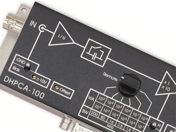 Variable (gain 10 to 60 dB), logarithmic (up to 80 dB) and wideband (DC to 10, 200 or 500 MHz) voltage amplifiers are available. Low frequency devices include the control of gain settings and bandwidth by switches directly on the amplifier. The dependence of the gain setting with the bandwidth is minimised, allowing rise/fall times to remain constant across the gain settings.