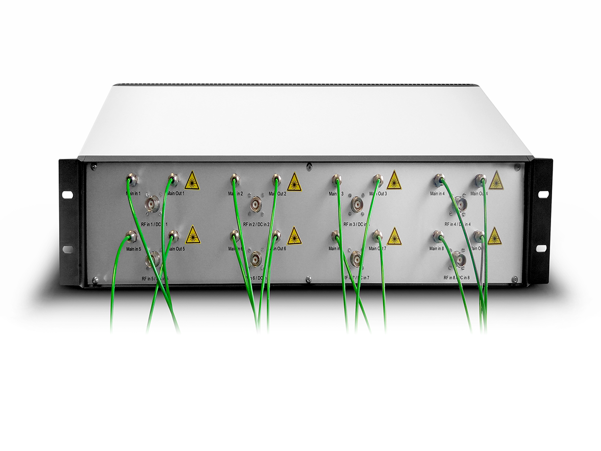 The ModBox operates at 1064nm and is composed of 4 or 8 parallel and independent channels for adjusting the phase of each to match the others.  Each channel allows an adjustment of the temporal phase for synchronisation of all beams.  The design integrates iXblue’s proprietary low frequency phase modulator combined with its matching RF electronics selected for high accuracy and for wide delay range tunable optical delay line.