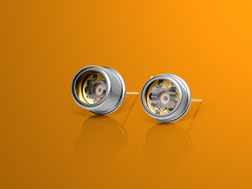 While regular SiC with “4H” crystal structure shows reduced responsivity above 360 nm wavelength, we now supply, as the only worldwide producer, “6H-SiC” material with extended wavelength response. Our new sensors are available with 0.05 mm² and 0.1 mm² active areas, TO5 and TO18 packages, and include optional integrated band pass optical filters.
