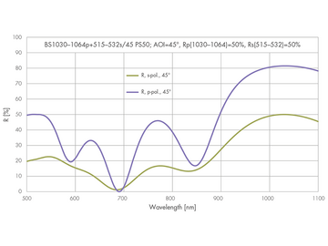 If you wanted to split two beams of a frequency-doubled laser at a 50:50 ratio, you used to need two optical components: a beam splitter and a polarizer. With our double beam splitter, we have combined both functions into one component, saving space in setup and time in servicing. With frequency doubling, the wavelength is divided in half and the polarization rotated, allowing green p-pole radiation to be generated from infrared s-pole. LASER COMPONENTS has developed a beam splitter in which a combined beam with the wavelengths 1030 nm and 515 nm are split in such a way that 50% of each of the beam components is reflected or transmitted, despite the different polarization of the two wavelengths. It is now possible to create individual adaptations of the reflection/transmission ratio according to your requirements, as well as changes to the polarization and wavelengths. Please inquire about this new product!