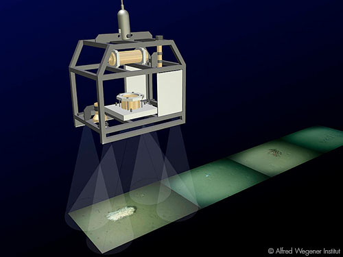 The most important research equipment at Hausgarten includes camera systems towed by ships, such as the ocean floor observation system (OFOS) and the ocean floor observation and bathymetry system (OFOBS). High-resolution images of the sea floor are captured using a vertically-downward-aligned digital SLR camera, a video camera, spotlights, and flash lamps. The OFOBS is also equipped with a sonar system. All the components are housed in such a way that withstand the enormous pressure load at water depths of up to 6000 meters. OFOS and OFOBS are lowered on a steel cable to approx. 1.5 meters above the sea floor to not affect the structures being recorded. The cable accommodates fiber optic cables for data and video transmission, and a copper cable for the power supply. A research vessel pulls the structure weighing several tons through the area to be surveyed at 1 km/h. During this process, the video camera takes HD recordings of the seabed, while the single-frame camera provides a 23-megapixel snapshot every 30 seconds.