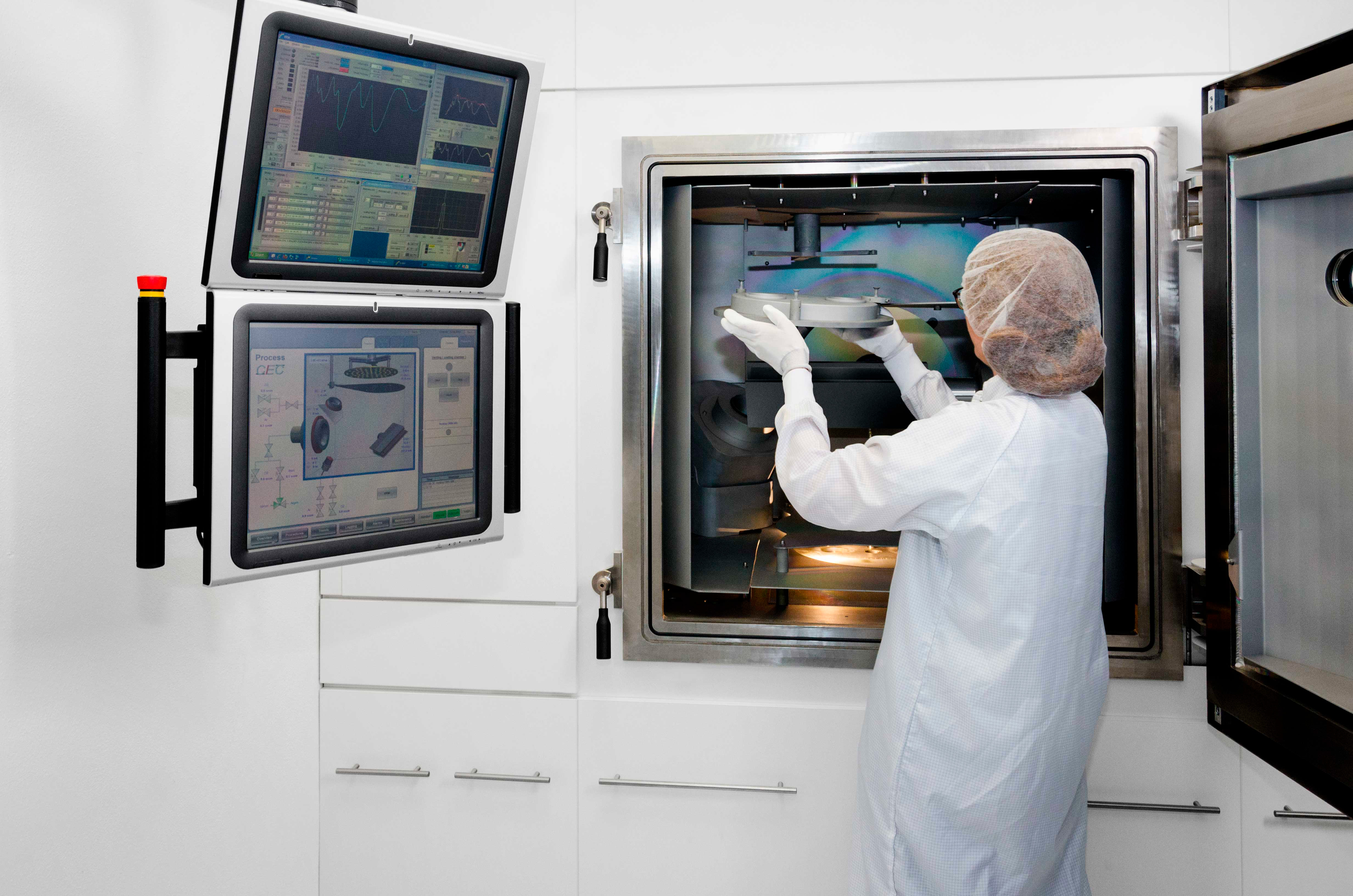 We use the IBS coater to manufacture particularly complex coating designs with more than 100 layers. Ion beam sputtering (IBS) makes it possible to create very compact and homogeneous layers that retain barely any water and are thus extremely low drift. This combination makes the coatings insensitive to temperature fluctuations.