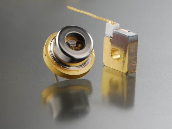In addition to the pulse laser diodes, we now offer continuous wave laser diodes at 808 nm with 1000 mW power from our in-house production. The base material is a reliable InGa(Al)As/GaAs material with a standard wavelength selection of +/- 3 nm. A power of 500 mW is already attainable at 1.1 A with this highly efficient structure. The laser chip is embedded in a hermetically sealed 9 mm CD package.